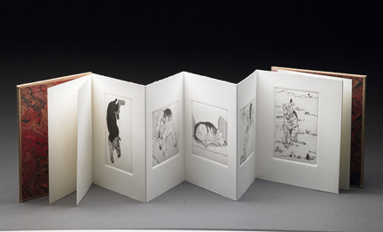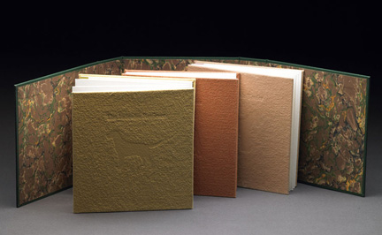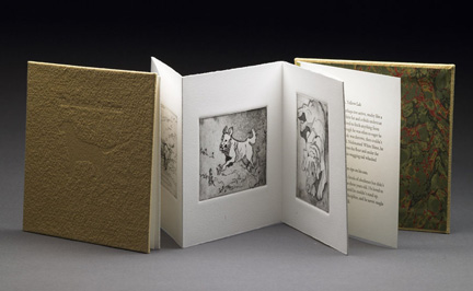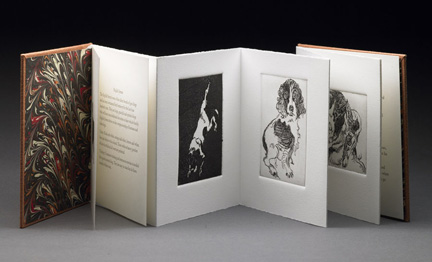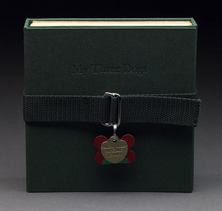 A set of three concertina books in a Japanese-style wrapper. Webbing closure with 3 dog tags on ring. Each book has 5 etchings printed on BFK with text before and after the images. The first text describes the breed standard, and the second describes my dog. St. Armand paper on book covers, Iris bookcloth on wrapper. Titles blind-stamped into wrapper and each book has the name and a silhouette of the breed stamped onto the cover. Edition 15.