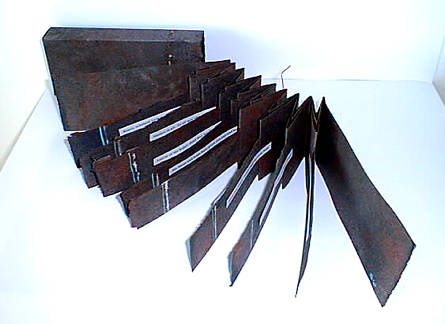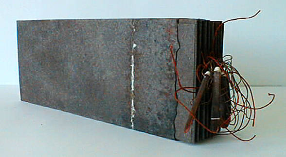 Sonnet to a Child by Tara Bryan (1997) Closed unique artists book. Text by Wilfred Owen. Dieu Donne paper, sea urchin spines, copper wire and inkjet printed text. 3 5/8"x 10"x 1 1/2" closed.